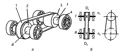 Передача плоскопасова (рисунок 2.10) складається з ведучого I і веденого II валів, підшипників 4, в яких ці вали обертаються, шківів 2, 3 і паса 1. Рух від вала I до вала II передається завдяки силам тертя, які виникають між шківом і пасом. Позначимо діаметр шківа, закріпленого на ведучому валі, через D1, діаметр шківа, закріпленого на веденому валі, через D2. При відсутності ковзання між шківами і пасом лінійні швидкості точок, взятих відповідно на робочих поверхнях ведучого і веденого шківів V1 i V2, можна записати так V1= p ·D1·n1; (2.2) V2 = p ·D2·n2. (2.3)