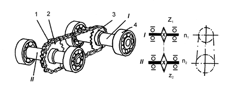 Передача ланцюгова складається із ведучої зубчатки 3 (рисунок 2.11) з числом зубців z1, закріпленої на валі I, веденої зубчатки 2 з числом зубців z2, закріпленої на валі II і підшипників 4. Зубчатки з’єднані між собою ланцюгом 1. Обертальний рух передається від вала 1 до вала II, через зубчатку 3, ланцюг і зубчатку 2. Передавальне відношення ланцюгової передачі