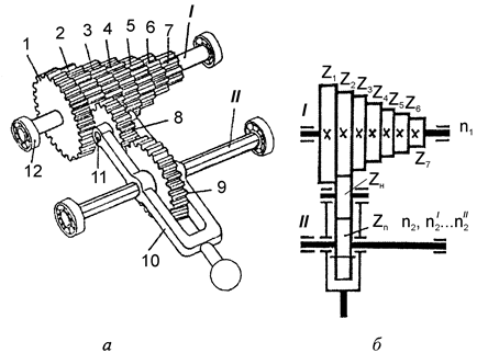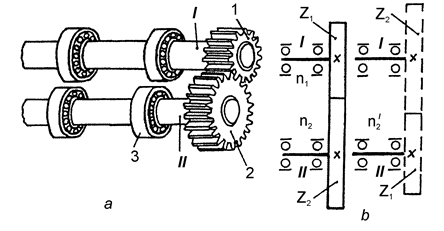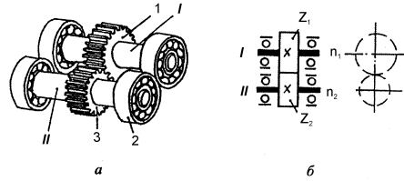 а-загальний вигляд; б-умовне позначеня; I - вал ведучий; II - вал ведений 1, 2 - зубчасте колесо; 3 - підшипник кочення; z1, z2 - число зубців коліс; n1, n2I - частота обертання веденого вала Рисунок 2.17 - Механізм з переставними зубчастими колесами