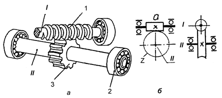 а - загальний вигляд; б-умовне позначення; I - ведучий вал; II - ведений вал; 1 - черв’як; 2 - підшипник кочення; 3 - черв’ячне колесо; а - число заходів черв’яка; z - число зубців черв’ячного колеса; n1- частота обертання ведучого вала; n2 - частота обертів веденого вала Рисунок 2.14 - Передача черв’ячна