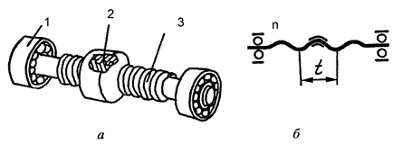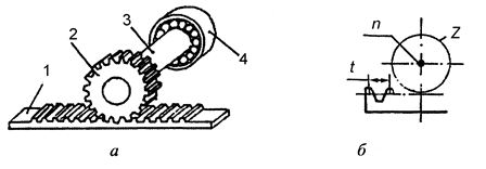 S = t · n, мм/хв. (2.8) а-загальний вигляд; б-умовне позначення; 1 - підшипник кочення; 2 - гайка; 3 - гвинт; t - крок гвинта; n - частота обертання гвинта Рисунок 2.15 - Передача гвинтова Передача рейкова служить для перетворення обертального руху шестерні в прямолінійний рух рейки чи навпаки. Передача складається з шестерні 2 (рисунок 2.16) з кількістю зубців z, вала 3, підшипників 4 і рейки 1. Якщо t - крок рейки, то за один оберт шестерні рейка переміститься на величину t·z, а за n обертів шестерні - відповідно на величину S S = t · z · n, мм/хв. (2.9)