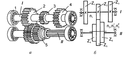 а-загальний вигляд; б-умовне позначення; I - вал ведучий; II - вал ведений 1 - підшипник кочення; 2, 3, 4 - зубчасті колеса ведучого валу; 5 - блок зубчастих коліс веденого вала; z1, z2, z3 - число зубців коліс ведучого вала; z4, z5, z6 - число зубців блока; n2, n21, n2II - частота обертання веденого вала Рисунок 2.18 - Механізм з потрійним пересувним блоком зубчастих коліс