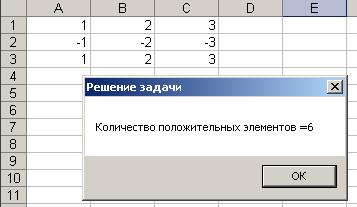 Sub primer_12() N = 3: M = 3 ReDim A(N, N) As Integer For I = 1 To N For J = 1 To M A(I, J) = Cells(I, J) Next J Next I k = 0 ‘ счетчик числа положительных элементов For I = 1 To N For J = 1 To M If A(I, J) > 0 Then k = k + 1: Next J Next I If k = 0 Then MsgBox "Положительных элементов нет",, "Решение задачи" Else: MsgBox "Количество положительных элементов =" & k,, "Решение задачи" End If End Sub