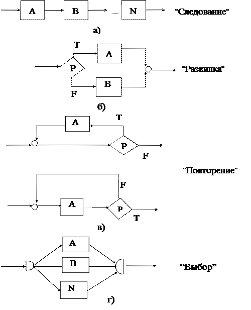Под методом проектирования понимают выбор того или иного метода и технологии разработки программных средств, обеспечивающего создание готового программного продукта. Это подразумевает как проектирование системы и ее реализацию на каком-либо языке программирования, так и компоновку сложно программной системы из отдельных блоков. Существует несколько способов конструирования программ на основе общепризнанных подходов, к которым относятся: структурный подход; модульное проектирование; объектно-ориентированное проектирование; проектирование с использованием CASE - средств, а также групповые методы разработки программного обеспечения. Рассмотрим кратко основы каждого из подходов. Структурный подход. В основу структурного программирования положены следующие положения: 1. Алгоритм и программа должны составляться поэтапно (по шагам). 2. Сложная задача должна разбиваться на достаточно простые подзадачи, каждая из которых имеет только один вход и один выход. 3. Логика алгоритма и программы должны опираться на минимальное число простых базовых управляющих структур. 4. Соответствующее представление данных с использованием большого числа разнообразных типов. Первые два положения будут подробно рассмотрены в следующем параграфе. Здесь более детально остановимся на третьем положении.