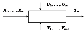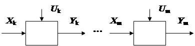 Сложный многостадийный процесс можно рассматривать как единый блок (рис. 5.3), модель которого ищется в зависимости выходной величины от входов и выходов всех подсистем Y m = f(X 1, …, X m; U 1, …, U m; Y 1, …, Y m- 1 ),(5.19) где m – количество подсистем; X i (i = 1, …, m) – вектор входных контролируемых переменных i -й стадии; U i (i = 1, …, m) – вектор управляющих переменных i -й стадии; Y j (j = 1, …, m -1) – вектор выхода j -й стадии; Y m – критерий многостадийного технологического объекта. В основе такого подхода к рассмотрению многостадийного технологического объекта лежит идея «черного» или «серого ящика», когда модель строится только по наблюдаемым значениям входных и выходных переменных («черный ящик») с использованием, быть может, некоторой априорной информации о механизме протекающих в объекте явлений («серый ящик»). Построение модели (5.19) связано с определенными сложностями. Это, во-первых, различные динамические свойства участков, заключенных между Y m и X i. Различное время запаздывания требует, например, при использовании регрессионных методов для построения модели, различной частоты съема данных, различного времени для накопления выборок необходимого объема. Обработка экспериментального материала, если бы он и мог быть получен, тоже будет чрезвычайно громоздкой и сложной, особенно если учесть необходимость выбора наилучшей модели. Вторая сложность, связанная с построением модели (5.19), вызывается коррелированностью переменных. Она резко увеличивает объем вычислительной работы, а иногда может сделать и принципиально невозможным построение математической модели. Следует заметить, что участкам Y m – X 1, Y m – X 2, …, Y m – X m на практике не удается назначить критерий оптимальности. Поэтому эти участки не могут рассматриваться как отдельные подсистемы объекта. Таким образом, построение математической модели в виде (5.19) на основе экспериментальных данных практически едва ли выполнимо - непомерно большим становится время накопления данных, резко растут объемы необходимой экспериментальной информации, вычислительные трудности и т.п. Использование аналитических моделей при таком подходе тоже невозможно, поскольку сложный технологический процесс охватывает множество подпроцессов различной химической природы (химические реакции, процессы смешивания, разделения, тепло- и массообмена), многие из которых не имеют точного математического описания. Таким образом, возникает задача упрощенного рассмотрения многостадийного процесса, перехода к меньшему числу переменных, такой организации процедуры экспериментирования и построения математической модели, которая может быть выполнена экономичными и доступными средствами. Иногда такое упрощение может быть достигнуто за счет использования метода декомпозиции, который широко применяется в автоматическом управлении. Этот структурный метод анализа систем основан на их представлении в виде соединения типовых звеньев, удовлетворяющих трем четким условиям: одномерности, направленности действия, типовой структуре уравнения звена. Менее строгим с математической точки зрения, но зато обоснованным с технологической точки зрения, является представление сложного многостадийного процесса в виде соединения типовых процессов. Конечная цель такого представления состоит в разбиении пространства переменных y 1, …, y