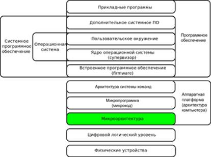 Аппаратная платформа включает: · АСК - Архитектура системы команд (ISA - instruction set architecture). АСК — это приблизительно то же самое, что и модель программирования, с точки зрения программиста на языке ассемблера или создателя компилятора. · Микропрограмма (firmware - микрокод). Это системное программное обеспечение, встроенное («зашитое») в аппаратное устройство, и хранящееся в его энергонезависимой памяти ПЗУ. · Микроархитектура (иногда сокращаемая до µarch или uarch) — это способ, которым данная архитектура набора команд реализована в процессоре. Каждая архитектура может быть реализована с помощью различных микроархитектур. Реализации могут варьироваться в зависимости от целей данного дизайна или в результате изменений в технологиях. Архитектура компьютера является комбинацией микроархитектуры, микрокода и архитектуры. Центральный процеессор ЦП (или центральное процессорное устройство — ЦП; central processing unit - CPU) - микросхема, исполнитель машинных инструкций (кода программ), главная часть аппаратного обеспечения компьютера. Иногда называют МП или просто процессором.