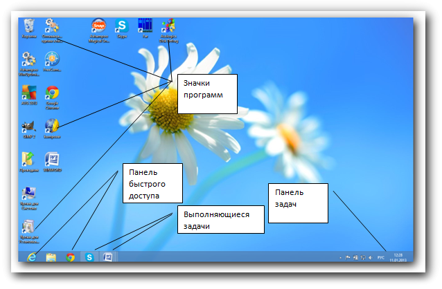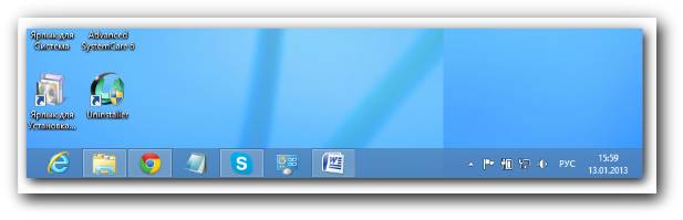 На рабочем столе находятся значки программ. Этих значков может быть любое количество, которое зависит от пользователя. После установки Windows 8 на рабочем столе находится три значка – Корзина, Ярлык для Система и Ярлык для установки, удаления программ. Позже мы их рассмотрим подробнее. Нижняя строка состоит из трех частей: Панели быстрого доступа, линия, где находятся выполняющиеся задачи и панель задач. Панель быстрого доступа после установки Windows содержит два значка – программу Internet Explorer (
