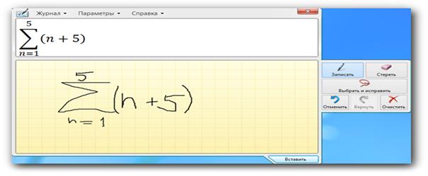 Служебные. Панель математического ввода. Данная программа позволяет записать математическую формулу. Напишите формулу в нижней части окна и сверху появится эта же формула, но записанная стандартными средствами. Записать в файл, либо в буфер обмена, к сожалению, не удастся, но при помощи предыдущей программы Ножницы, можно снять фрагмент с формулой и записать в файл.