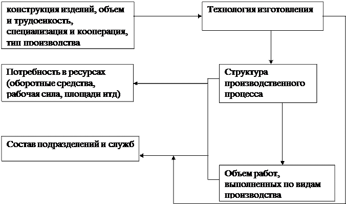 Основной, вспомогательный, обслуживающий – соответственно: изготовление продукции в соответствии со специализацией, продукция которого используется в основном П непосредственно (инструмент), обеспечивающий бесперебойную работу. Процесс состоит из операций, которые определяют его структуру. Операция - часть ПП, выполняемая на одном рабочем месте, одними и теми же средствами труда над одними и теми же предметами труда, одним или несколькими рабочими без переналадки оборудования. Виды операций: основные, в процессе которых происходит изменение формы, свойств, объема, взаиморасположения предметов труда; вспомогательные, в процессе которых происходит изменение месторасположения деталей, сборочных единиц в пространстве, контроль; Процесс может быть: дискретный, непрерывный, импульсивный (свойства 2 первых); простым, сложным – соответственно из ряда последовательных операций изготовления определенного объекта и совокупность координированных во времени простых процессов; трудовым, естественным– соответственно выполняются с участием и без участия человека. Структура ПП определяет состав подразделений предприятия. На структуру ПП в машиностроении оказывают влияние следующие факторы: конструкция изделий, объем выпуска, трудоемкость, уровень специализации, кооперирования. Структура ПП и объем работ определяют потребность в ресурсах. Взаимосвязи факторов, влияющих на ПП, представлены на рис. 1.2.1.