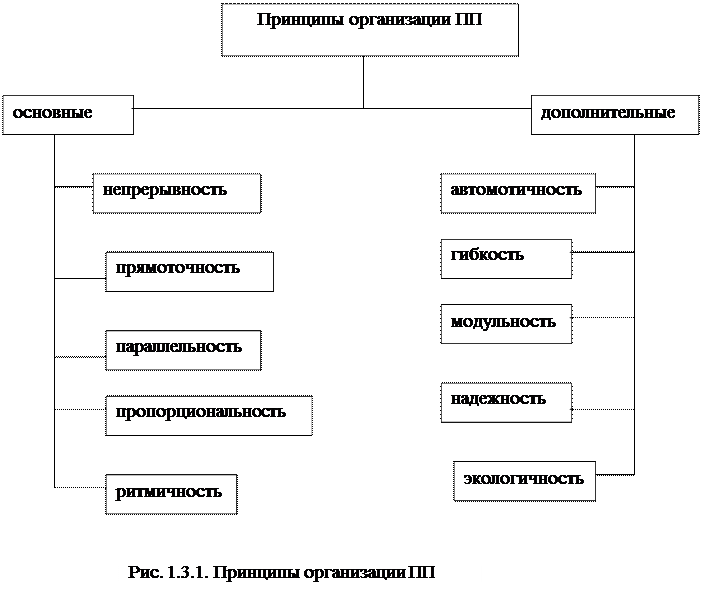 1.3. Принципы организации ПП Организация ПП на предприятии машиностроения включает в себя строгое разделение труда между подразделениями на основе их специализации, рационального размещения и полного использования средств труда на каждом специализированном участке, четкое распределение рабочих, обеспечивающих всем необходимым для высокопроизводительного труда, упрощения маршрутов движения деталей, правильное планирование в пространстве и времени (рис. 1.3.1.).