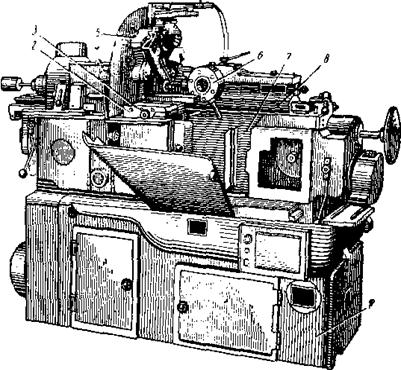 Рис. 3.3.1. Компоновка токарного станка: 1 – основание; 2 – передний поперечный суппорт; 3 – продольный суппорт; 4 – шпиндельная бабка; 5 – вертикальный суппорт; 6 – револьверная головка; 7 – станина; 8 – суппорт револьверной головки На рис. 3.3.2. приведена компоновка радиально-сверлильного станка. К фундаментной плите 1 крепят неподвижную колонну 2 с поворотной гильзой 3. На гильзе установлена траверса 4, которая может перемещаться по ней и закрепляться с помощью механизма 5 на определенной высоте в зависимости от размеров обрабатываемой заготовки. Шпиндельная головка 6, внутрикоторой находятся коробка скоростей 7 и коробка подач 8, перемещается по направляющим траверсы в горизонтальном направлении и вместе с траверсой поворачивается вокруг колонны. Шпиндель 9 с инструментом получает главное вращательное движение и движение подачи (поступательное вертикальное). Заготовку закрепляют на столе 10 или непосредственно на фундаментной плите 1.