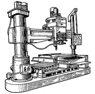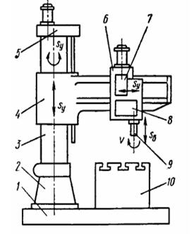Рис. 3.3.2. Компоновка радиально-сверлильного станка На рис. 3.3.3. приведена компоновка вертикально-фрезерного станка. В станине 1 размещена коробка скоростей 2. Шпиндельная головка 3 смонтирована в верхней части станины и может поворачиваться в вертикальной плоскости. При этом ось шпинделя 4 можно поворачивать под углом к плоскости рабочего стола 5. Главным движением является вращение шпинделя. Стол, на котором закрепляют заготовку, имеет продольное перемещение по направляющим салазок 6. Салазки имеют поперечное перемещение по направляющим консоли 7, которая перемещается по вертикальным направляющим станины. Таким образом, заготовка, установленная на столе 5, может получать подачу в трех направлениях. В консоли смонтирована коробка