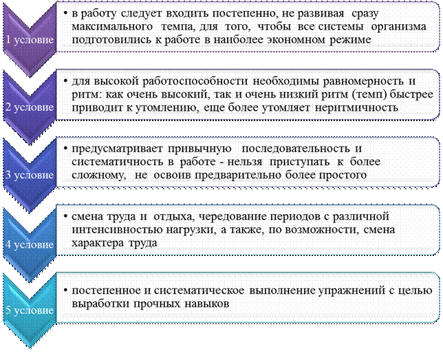 Все вместе при соответствующем отношении к труду они обеспечивают оптимальный уровень его продуктивности, то есть работоспособность человека. Работоспособность может ухудшиться и вследствие пребывания человека в необычных (экстремальных) условиях: например, при высокой температуре и влажности окружающего воздуха, при недостатке кислорода и т. д. Для того чтобы работать в оптимальном режиме и достичь пика своей работоспособности, необходимо соблюдать несколько основных условий: