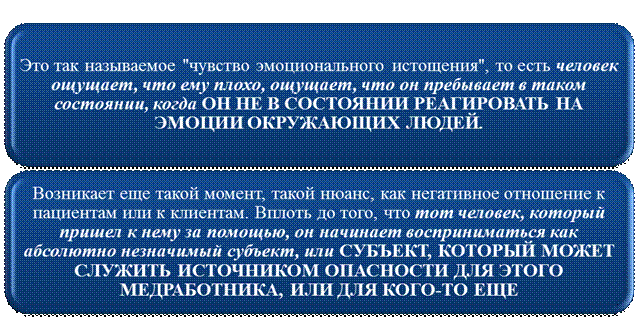 В мире до сих пор идут споры о том, болезнь ли это или нормальная реакция на необходимость постоянного общения с людьми, которых ты не выбираешь, которые зачастую по-человечески тебе не близки. Но эта болезнь уже есть в Международном классификаторе болезней (МКБ-10). Болезнь это или нет, но совершенно очевидно, что приходя к медработнику, пациент ждет не только профессиональной помощи, но и человеческого сочувствия, и особенно - когда ситуация трагична и опасна. Интересная постановка вопроса: как Вы думаете - может ли что-то заметить пациент, пришедший к медработнику? Наверное, может. Но мне кажется, гораздо важнее то, что человек, который "выгорел " сам, вот он, как это ни парадоксально, может быть, или, наоборот, ни закономерно, он не замечает ничего. Он считает, что все, что происходит, это абсолютно нормально. Еще в 70-х годах очень известный исследователь американский КРИСТИНА МАСЛАЧ определила, что такое " СИНДРОМ ЭМОЦИОНАЛЬНОГО ВЫГОРАНИЯ ":