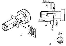 Наряду с видами и разрезами при выполнении изображений предметов применяются сечения. Они служат для выяснения поперечной формы (профиля) всего предмета или какой-нибудь его части. Рис. 11 Сечением называется изображение фигуры, получающееся при мысленном рассечении предмета одной или несколькими плоскостями. На сечении показывают только то, что непосредственно попадает в секущую плоскость. Способ получения сечения указан на рисунке 11, а. Плоскость сечения указывается разомкнутой линией со стрелками, нанесенной по обе стороны основного изображения, а сечение обозначается надписью «А-А», «Б-Б» и т.п. (см. рис.. 11, б)