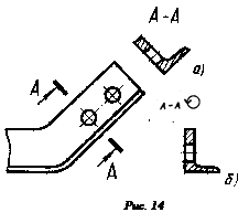 Если фигура сечения симметрична вдоль линии рассечения и расположена на продолжении этой линии, то его не обозначают (рис. 13). Контуры отверстий или углублений, имеющих форму поверхностей вращения в сечении, показывают полностью (рис. 14 и 15). Если предмет имеет несколько одинаковых сечений, секущие плоскости обозначают одной и той же буквой (рис. 15). Вынесенные сечения, как и разрезы, полученные плоскостями, непараллельные плоскостям проекций, допускается располагать произвольно, а также поворачивать, в последнем случае ставят знак «повернуто» (см. рис. 14, б и 15).