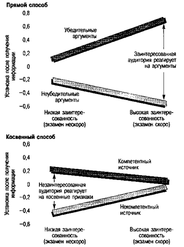 Рис. 7.9. Изменение установки: прямой и косвенный способы убеждения. Прямой способ:когда заинтересованные в этом вопросе студенты колледжа получили сообщение, обосновывающее необходимость сдачи факультетского экзамена до церемонии вручения диплома, они сочли слабую аргументацию неубедительной, а сильную – убедительной (верхняя прямая). Косвенный способ:когда аналогичную информацию сообщили незаинтересованной аудитории, – студентам было сказано, что изменения экзаменационной политики начнутся через десять лет, – качество аргументов не повлияло на изменение установки, зато на него повлиял авторитет источника информации. (Источник:R. E. Petty, T. J. Саcioppo & R. Goldman. «Personal Involvement as a Determinant of Argument-Based Persuasion», Journal of Personality and Social Psychology, 41, 1981, p. 847-855) Теория, в основе которой лежит простая мысль о том, что решающее значение имеют мысли, возникающие у нас в ответ на сообщение,особенно если у нас есть основания обдумать его содержание и мы способны на это, помогает понять некоторые экспериментальные данные. Например, мы с большей готовностью склонны верить вызывающим доверие, квалифицированным коммуникаторам, если используем косвенный способ. Если мы верим источнику информации, то более благосклонно воспринимаем его слова и, как правило, не ищем контраргументов. Однако отсутствие доверия к коммуникатору заставляет нас обращаться к прямому способу. Поскольку мы тщательно обдумываем содержание его сообщения, то, скорее всего, в конце концов отвергнем его слабо аргументированную информацию (Priester & Petty, 1995). Возможно, именно этот продавец подержанных автомобилей и знает кое-что о машинах, но им традиционно принято не доверять, а никто не хочет быть дураком, которого можно обвести вокруг пальца! Поэтому мы, вероятно, отнесемся к его словам с меньшим доверием, чем отнеслись бы, окажись на его месте человек, вызывающий большее доверие. На основании этой теории было сделано и немало прогнозов, большинство из которых были подтверждены экспериментально Петти, Качоппо и другими (Axsom et al., 1987; Harkins & Petty, 1987; Leippe & Elkin, 1987). Многие исследователи изучали способы стимуляции мышления, используя для этого риторические вопросы,представляя нескольких коммуникаторов (например, вместо одного коммуникатора, высказывавшего три аргумента, выступали три коммуникатора, каждый из которых представлял один аргумент), используя непринужденные позы (ораторы сидели, а не стояли), повторяя сообщение,заставляя испытуемых чувствовать ответственность за оценку сообщения или за невнимание к нему и создавая условия для того, чтобы внимание аудитории не рассеивалось. Использование всех этих приемов позволило исследователям сделать следующий вывод: стимуляция мышления делает хорошо аргументированные сообщения более убедительными, а слабо аргументированные (благодаря более активному поиску контраргументов) – менее убедительными. Теория имеет также и практическое значение. Эффективных коммуникаторов заботят не только их собственный имидж и сообщения, которые они делают, но и наиболее вероятная реакция аудитории, к которой они обращаются. Лучшие педагоги – это педагоги, которые вовлекают студентов в процесс активного мышления. Они задают риторические вопросы, приводят занимательные примеры и ставят студентов перед необходимостью решать сложные проблемы. Все эти приемы а