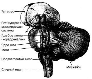 Рис. 4.10. Общее строение ретикулярной формации головного мозга человека Нарушение деятельности ретикулярной формации вызывает нарушение биоритмов организма. Так, раздражение восходящей части ретикулярной формации оказывает характерную для состояния бодрствования организма реакцию изменения электрического сигнала. Постоянное раздражение восходящей части ретикулярной формации приводит к тому, что у человека нарушается сон, он не может уснуть, организм проявляет повышенную активность. Подобное явление называется десинхронизацией и проявляется в исчезновении медленных колебаний электрической активности мозга. В свою очередь, преобладание волн низкой частоты и большой амплитуды вызывает длительный сон. Существует также мнение, что деятельность ретикулярной формации определяет характер реагирования на воздействия объектов и явлений внешнего мира. Принято выделять специфическую и неспецифическую реакции организма. В упрощенном виде специфическая реакция — это обычная реакция организма на привычный, или стандартный, раздражитель. Суть специфической реакции заключается в формировании стандартных адаптивных форм реагирования на знакомый внешний раздражитель. Неспецифическая реакция — это реакция организма на необычный внешний раздражитель. Необычность может заключаться как в превышении силы обычного раздражителя, так и в характере воздействия нового неизвестного раздражителя. При этом ответная реакция организма носит ориентировочный характер. Благодаря наличию такого типа реакций организм имеет возможность впоследствии сформировать адекватную адаптивную реакцию на новый раздражитель, что сохраняет целостность организма и обеспечивает его дальнейшее нормальное функционирование.
