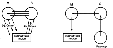 Рис. 5.3. Принципиальное различие концепций построения движений на основе рефлекторной дуги и рефлекторного кольца. Объяснения в тексте