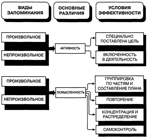 Следовательно, для того чтобы запомнить как можно лучше, надо обязательно ставить цель — не только воспринять и понять материал, но и действительно запомнить его. Следует отметить, что большое значение при заучивании имеет не только постановка общей задачи (запомнить то, что воспринимается), но и постановка частных, специальных задач. В одних случаях, например, ставится задача запомнить только суть воспринимаемого нами материала, только главные мысли и наиболее существенные факты, в других — запомнить дословно, в третьих — точно запомнить последовательность фактов и т. д. Таким образом, постановка специальных задач играет существенную роль в запоминании. Под ее влиянием может меняться сам процесс запоминания. Однако, по мнению С. Л. Рубинштейна, запоминание очень сильно зависит от характера деятельности, в ходе которой оно совершается. Более того, Рубинштейн полагал, что нельзя делать однозначные выводы о большей эффективности произвольного или непроизвольного запоминания. Преимущества произвольного запоминания со всей очевидностью выступают лишь на первый взгляд. Исследования известного отечественного психолога П. И. Зинченко убедительно доказали, что установка на запоминание, делающая его прямой целью действия субъекта, не является сама по себе решающей для эффективности процесса запоминания. В определенных случаях непроизвольное запоминание может оказаться эффективнее произвольного. В опытах Зинченко непреднамеренное запоминание картинок в ходе деятельности, целью которой была их классификация (без задачи запомнить), оказалось определенно выше, чем в случае, когда перед испытуемым была поставлена задача специально запомнить картинки. Посвященное той же проблеме исследование А. А. Смирнова подтвердило, что непроизвольное запоминание может быть продуктивнее, чем преднамеренное: то, что испытуемые запоминали непроизвольно, попутно в процессе деятельности, целью которой было не запоминание, запомнилось прочнее, чем то, что они старались запомнить специально. Суть эксперимента состояла в том, что испытуемым предъявлялись две фразы, каждая из которых соответствовала какому-либо орфографическому правилу (например, «мой брат учит китайский язык» и «надо учиться писать краткими фразами»). В ходе эксперимента необходимо было установить, к какому правилу относится данная фраза, и придумать другую пару фраз на ту же тему. Запоминать фразы не требовалось, но через несколько дней испытуемым предложили вспомнить как те, так и другие фразы. Оказалось, что фразы, придуманные ими самими в процессе активной деятельности, запомнились примерно в три раза лучше, чем те, которые им дал экспериментатор. Следовательно, запоминание, включенное в какую-нибудь деятельность, оказывается наиболее эффективным, поскольку оказывается в зависимости от деятельности, в ходе которой оно совершается. Запоминается, как и осознается, прежде всего то, что составляет цель нашего действия. Однако то, что не относится к цели действия, запоминается хуже, чем при произвольном запоминании, направленном именно на данный материал. При этом все же необходимо учитывать, что подавляющее большинство наших систематических знаний возникает в результате специальной деятельности, цель которой — запомнить соответствующий материал, с тем чтобы сохрани