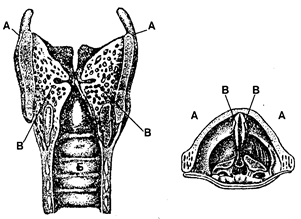 Рис. 13.1. Строение периферических органов речи. Объяснения в тексте Гортань (А) является продолжением дыхательного горла (Б). Она образована четырьмя хрящами, в пространстве между которыми расположены в горизонтальной плоскости голосовые связки. Голосовые связки (В) представляют собой две эластичные мышцы, которые приводятся в колебательное движение током воздуха, выходящего из дыхательного горла. Голосовые связки благодаря своему расположению и подвижности хрящей, к которым они прикреплены, могут осуществлять изменения двоякого рода. Во-первых, голосовые связки могут натягиваться или оставаться ненатянутыми. Во-вторых, они могут быть сомкнуты между собой или расходиться своими концами так, что между ними образуется пространство, называемое голосовой щелью. Благодаря этим особенностям происходит следующее: если голосовые связки натянуты и сближены между собой, т. е. голосовая щель закрыта, то выдыхаемый воздух, прорываясь между обращенными друг к другу краями связок, приводит их в колебательное движение, которое образует голосовую волну; если же связки не натянуты и голосовая щель не закрыта, то воздух проходит свободно, не вызывая никакого звука. Проходя сквозь гортань, ток воздуха порождает звуковую волну. Она попадает в полость рта и носа, которые выполняют функции резонирующей трубы. Полость рта является главным резонатором звуковых волн, возникших в гортани. Путем изменения величины и формы полости рта образуются различные звучания гласных звуков. Полость рта является также и органом, создающим преграды току воздуха, который, преодолевая эти преграды, порождает звуки, называемые согласными. Носовая полость выполняет функцию дополнительного резонатора, проход в который может быть открыт или закрыт нёбной занавеской (задней подвижной частью нёба). В первом случае получаются так называемые носовые звуки — м, н. Во втором случае — звуки неносовые. Развитие способности произнесения членораздельных звуков связано с развитием способности их воспринимать. Вряд ли человек смог бы достичь такого уровня владения голосовым аппаратом, когда он может говорить членораздельно, если бы одновременно с этим не развивались органы слуха. Обучаясь говорить членораздельно, человек учился и понимать то, что он говорит. Речевая деятельность всегда находится под контролем, и в нее могут быть внесены необходимые коррективы только благодаря слуху. Развитие слуха человека происходило за счет развития центрального аппарата, что выражается в усложнении коры головного мозга. Если сравнить мозг обезьяны и мозг человека, то мы обнаружим, что слуховая зона коры у человека относительно больше аналогичной зоны коры головного мозга обезьяны. Однако эти различия выражаются не только в количественных показателях — увеличении площади слуховой зоны. У человека в этой зоне находятся специфические речевые центры (рис. 13.2).