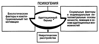 Рис. 18.1. Схематическое представление о системной организации функционального обеспечения адаптированной психической деятельности (по Ю. А. Александровскому). Объяснения в тексте Адаптационный барьер — это условная граница параметров внешней среды, в том числе и социальной, за которыми адекватная адаптация невозможна. Характеристики адаптационного барьера строго индивидуальны. По мнению Александровского, они зависят как от биологических факторов среды и конституционального типа человека, так и от социальных факторов и индивидуально-психологических особенностей личности, определяющих адаптационные возможности (рис. 18.2). К таким личностным образованиям мы относим самооценку личности, систему ее ценностей и др. Следовательно, мы должны сделать вывод о том, что успешность адаптации определяется нормальным функционированием систем физиологического и психического уровня. Однако эти системы не могут функционировать, не соприкасаясь друг с другом. Вполне вероятно, что существует компонент, который обеспечивает взаимосвязь этих двух уровней и обеспечивает нормальную деятельность человека. Мы также должны предположить, что этот компонент должен иметь двойственную природу: с одной стороны, психическую, с другой — физиологическую. Таким компонентом в системе регуляции процесса адаптации выступают эмоции.