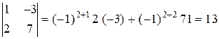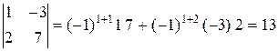 Определители и их свойстваОпределителем квадратной матрицы А называют число, символически обозначаемое в компактном виде det(A) или записывают так Число n называют порядком определителя. Если в определителе вычеркнуть строку i и столбец j, то останется определитель порядка n-1. Этот определитель называют минором элемента aij и обозначают Мij. Если минор Мij умножить на (1)i+j, то полученный результат называют алгебраическим дополнением элемента aij. и обозначают Аij. Для вычисления определителя используют формулу (рекуррентную) Пример 1. 1. Вычислить определители Решение. Для первого определителя имеем