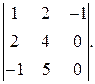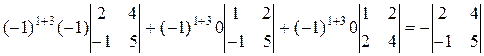 Отметим, что после первого знака равенства был вынесен множитель только из 1-й строки. Из второго столбца вынести ничего при этом нельзя, т.к. а12 уже стал равным 1. Далее по определению был раскрыт определитель по 1-й строке. После чего в полученном определителе 2-го порядка можно вынести множитель 2 из 2-го столбца. При этом знак слагаемого установлен устно во всех случаях. С7. Определитель, у которого элементы двух параллельных рядов соответственно пропорциональны, равен нулю. Достаточно из одного из пропорциональных рядов вынести общий множитель и в оставшемся определителе окажется два равных ряда. Далее смотри С5. С8. Если все элементы некоторого ряда представить как сумму двух слагаемых, то определитель будет равен сумме двух определителей, у которых вместо ряда-суммы будут стоять ряды слагаемых из сумм. Остальные ряды будут одинаковы. Для доказательства достаточно раскрыть определитель по ряду, состоящему из суммы двух слагаемых. Затем полученную по определению сумму представить как сумму двух слагаемых, каждое из которых есть соответствующий определитель. С9. Если к некоторому ряду поэлементно прибавить параллельный ряд, умноженный на некоторое число, то определитель не изменится. Доказательство следует из С8 и С7. С10. Сумма произведений элементов ряда на алгебраические дополнения параллельного ряда равна нулю. При составлении алгебраических дополнений элементов параллельного ряда сами элементы в работе не участвуют. Значит вместо них можно взять что угодно, даже и нули(или элементы ряда, по которому производят раскрытие определителя). В любом случае (по С4 или С5) определитель станет равным нулю. С11. Можно рекомендовать вычислять определитель 2-го порядка по правилу - произведение элементов главной диагонали минус произведение элементов побочной диагонали. Указанные свойства удобно использовать при вычислении, анализируя состав элементов. Более практичным является прием “изготовления” нулей, используя указанные свойства. В последнем случае придерживаются алгоритма: - проанализируйте элементы на наличие числа (1 или -1 или другого небольшого числа); - пусть имеется 1 в строке k и столбце s; - составляем новый определитель, у которого строка k взята из исходного определителя; - последовательно умножаем все элементы строки k на некоторые множители и поэлементно складываем с параллельными строками так, чтобы в столбце s во всех строках (кроме строки k) образовались нули; - раскрываем определитель по элементам столбца s (т.к. в нем только один элемент aks отличен от нуля). Строка k в процессе работы не изменяется, как всякий инструмент, на острие которого расположен рабочий элемент aks. Пример 1.3. Вычислите определитель