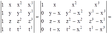 Поясним выполненное. Первая строка умножена на -1 и сложена поэлементно с остальными. Теперь раскрываем определитель по 1-му столбцу. После чего из 2-го строки можно вынести множитель (y-x), из 3-ей строки (z-x) и из 4-й вынести (t-x). Получаем в результате (y-x) (z-x)(t-x) Если теперь 2-ю строку умножить на -1 и сложить поэлементно с остальными то получим