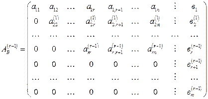 Эти уравнения могут появляться, если соответствующие уравнения исходной системы (1) представляют собой линейные комбинации других уравнений этой системы. Таким образом метод Гаусса, позволяет на определенном шаге установить возможную несовместность исходной системы линейных уравнений или выявить и удалить уравнения, являющиеся линейными комбинациями других уравнений системы (1), если она совместна. Пусть система (1) совместна, тогда все правые части уравнений (2) равны нулю, и после удаления нулевых уравнений в эквивалентной системе и нулевых строк в расширенной матрице получаем матрицу специфического ступенчатого вида, ранг которой равен r. Все элементы этой матрицы, стоящие слева или ниже элементов