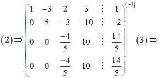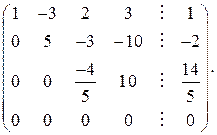 Последняя нулевая строка в расширенной матрице, полученной после 3-го шага, появилась из-за того, что в исходной системе четвертого уравнения является суммой 1-го и 3-го уравнений. Система совместна, и после удаления нулевой строки заключительный вид расширенной матрицы соответствует системе трех уравнений с четырьмя неизвестными (ранг системы меньше числа неизвестных). Полагая