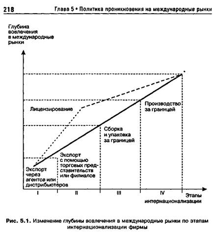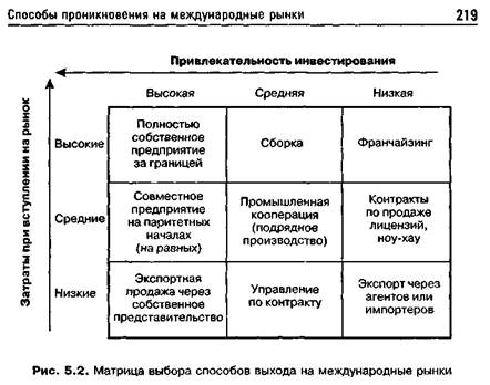 Уровень затрат, связанных с выходом на зарубежный рынок3. Степень привлекательности инвестирования (матричное представление способов выхода на внешний рынок исходя из учета последних двух характеристик иллюстрирует рис. 5.2). Выбор наиболее эффективного способа (стратегии) требует комплексных расчетов и обоснований. Альтернативные стратегии проникновения на внешний рынок представлены на рис. 5.3, а их сравнительные характеристики приведены в табл. 5.1. Рассмотрим особенности каждого способа и условия их использования. Под экспортом понимается реализация на зарубежных рынках товаров и услуг, которые производятся или выполняются в своей стране.