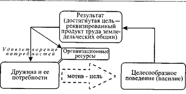 Получение ресурсов путем грабежа земледельческих общин можно назвать воспроизводством ресурсов как таковым лишь условно. По своей сути оно было формой перераспределения продуктов чужого труда. В этом контексте дружина не была самодостаточным образованием, способным полностью обеспечить себя всем необходимым. Поэтому в отличии от общины поведение дружины, ее цели были постоянно направлены вовне, в более широкий межобщинный контекст. Эта внешняя направленность поведения обеспечила дружине роль связующего звена между самодостаточными земледельческими общинами. И хотя общины были по-прежнему полностью разобщены, они со временем, нередко не ведая того сами, оказались объединенными в некую общую структуру. Процесс формирования этой структуры, по-видимому, был чрезвычайно долгим. На первых порах единственным, что объединяло местную дружину и соседние общины, была периодическая необходимость последних делиться своими ресурсами с дружинниками. Примитивные средства ведения войны не давали однозначного преимущества их обладателям, и в значительной степени все определялось преимуществом в физической силе и спецификой групповой организации нападавших и оборонявшихся. Почему же дружине со временем удавалось стать сильнее превосходивших их по численности общин и навязать им устойчивые даннические отношения? Важно подчеркнуть, что новая дружинно-общинная структура возникла не как разложение общины и индивидуализация целей поведения отдельный семей или индивидов, а как объединение двух разнокачественных групп: дружины и некоторого числа земледельческих общин. В начале нападавшие, вероятно, были таким же общинным образованием, что и земледельческие общины, и совмещали земледелие с набегами на соседей. Эти нападения, разумеется, мало напоминали сюжеты современных фильмов о захвате двумя вооруженными бандитами поселка мирных фермеров. Первобытно-примитивные средства нападения могли обеспечить победу только в том случае, если в набеге на земледельческую общину принимала участие вся дружина, т. е. все боеспособные члены. При этом долгое время вооруженная группа была таким же органом коллективного выживания, что и земледельческая община. В случае успешного нападения на соседей и захвата их ресурсов последние по-прежнему распределялись по уравнительно-потребностному принципу, обеспечивая достижение общей цели дружины — выживания группы как целого. Рассмотрим, в чем же состояла психологическая специфика деятельности дружины (рис. 4. 2).