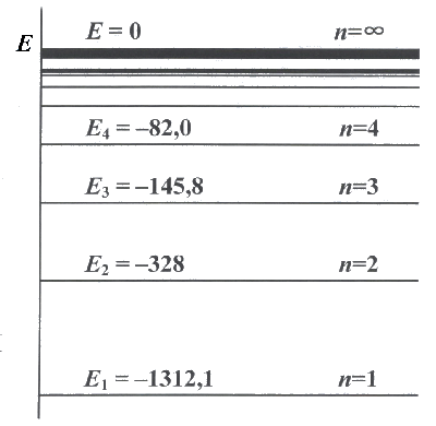 Квантовые числа, возникающие при решении волнового уравнения, служат для описания состояний квантово-химической системы. Каждая атомная орбиталь характеризуется набором из трех квантовых чисел: главного n, орбитального l и магнитного ml. Главное квантовое число n характеризует энергию атомной орбитали. Оно может принимать любые положительные целочисленные значения. Чем больше значение n, тем выше энергия и больше размер орбитали. Решение уравнения Шрёдингера для атома водорода дает следующее выражение для энергии электрона: E = −2π2 me 4 / n 2 h 2 = −1312,1 / n 2 (кДж/моль) Таким образом, каждому значению главного квантового числа отвечает определенное значение энергии электрона. Уровни энергии с определенными значениями n иногда обозначают буквами K, L, M, N... (для n = 1, 2, 3, 4...). Орбитальное квантовое число l характеризует энергетический подуровень. Атомные орбитали с разными орбитальными квантовыми числами различаются энергией и формой. Для каждого n разрешены целочисленные значения l от 0 до (n −1). Значения l = 0, 1, 2, 3... соответствуют энергетическим подуровням s, p, d, f.