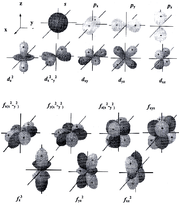 Форма s -орбиталей сферическая, p -орбитали напоминают гантели, d - и f -орбитали имеют более сложную форму.