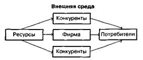 Рис. 9. Конкуренция за ресурсы и потребителей Фирма как система связана с внешней средой главным образом посредством входа и выхода. Именно за вход (input) и выход (output) конкурируют организации. Выход является целью системы, поэтому системы конфликтуют при пересечении целей. Вход необходим системе для достижения целей фирмы. Входом фирмы как системы выступают ресурсы: финансовые, материальные (сырье, материалы, комплектующие изделия, новое оборудование), кадры и знания (втом числе технологии), информация (в том числе документы), различные виды энергии. Выходом фирмы как системы является продукция или услуги, направляемые потребителям. Причем наличие потребителей является необходимым атрибутом выхода данной системы. При отсутствии потребителей конечный результат деятельности системы будет оставаться внутри системы. Таким образом, в качестве объектов конкуренции можно определить ограниченные ресурсы, относящиеся ко входу в фирму, и ресурсы, относящиеся к выходу системы фирмы, такие как потребители, ограниченный спрос. В большинстве случаев главным объектом конкуренции являются потребители, а конкурентная борьба выражается в борьбе за долю рынка. В современных условиях все более важным объектом конкуренции является борьба за новые уникальные ресурсы, такие как информация и знания.