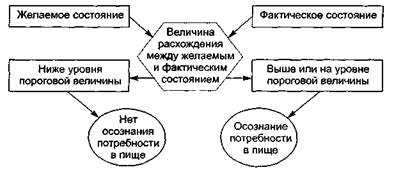 Начальным этапом любой модели процесса принятия решения о покупке является осознание потребности. В теории маркетинга считается, что это происходит тогда, когда активизируется нужда человека и он ощущает существенное различие между фактическим и желательным состоянием уровня потребления товара. Например, если человек ощущает голод (фактическое состояние) и хочет от него избавиться (желаемое состояние), то он тогда осознает потребность в пище, когда расхождение между этими двумя состояниями достигает существенного различия. Иными словами, когда состояние голода превышает некоторую характерную для данного человека пороговую величину (рис. 5.9).