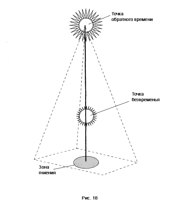 Первое знакомство со Сторожами произошло в пространстве вашей ментальной пирамиды. Вспомните, как вы создавали в позвоночнике энергетический луч, устремленный вверх. Нижний конец луча упирался в основание под вами. Боковые лучи — грани пирамиды — опустились на землю, и возникла сама пирамидальная конструкция. Место в центре основания, в которое упирается нижний конец центрального луча пирамиды, — точка гниения, или зона почвы. В этой зоне устойчиво пребывает большинство людей. Соответственно, их физические тела постоянно подвергаются негативному воздействию «зоны почвы», и годам к 60 большинство догнивает до тяжелых недугов, вегетативных расстройств или иных физических и психических проблем. Люди долго и часто безуспешно лечатся, силятся восстановить пошатнувшееся здоровье. Но разрушительные программы точки гниения оказываются сильнее. И находится простое и понятное оправдание этим неудачам — возраст... Почему именно точка гниения? Основание пирамиды — это плоскость, разделяющая наш и обратный миры. Граница взаимодействия соседних реальностей характеризуется неустойчивостью любых процессов, а физиологических в особенности. Читатель-скептик может недоверчиво хмыкнуть: наука ищет параллельные миры, а, оказывается, все просто — вообразил пирамиду, и готово — вы на границе соседних реальностей. Когда бы все так просто... Обратный мир, расположенный ниже основания пирамиды, скорее категория психоэнергетическая, нежели физическая. Человек, устойчиво пребывающий в точке гниения, холит и лелеет свои стереотипы отношения к болезням и погружен в них. Он не хочет ничего менять, поскольку объяснение, что, мол, «возраст пришел», оправдывает его личную бездеятельность и дает возможность чувствовать себя приобщенным к большой группе таких же болеющих, но не желающих что-либо менять в привычном жизненном укладе. Но когда появляются знание и желание исправить сложившуюся ситуацию, тогда становятся видны и возможности. В избавлении от негативного влияния на организм поможет точка безвременья. Она располагается на центральной оси пирамиды примерно на трети ее высоты от основания. В этой точке личное биологическое время затормаживается и постепенно останавливается. Пребывание в точке безвременья освобождает вас от груза житейских проблем, который вы, скорее всего, даже не ощущаете. Просто привыкли и тащите на себе с рождения. Почувствовать избавление от проблем можно единственным способом — освободившись от них. Когда вы войдете в точку безвременья, появится ощущение, будто невидимый пылесос вытягивает из вас груз забот и тревог. И когда этот тяжкий ворох исчезнет, станет легко. Затормаживание и постепенная остановка внутреннего биологического времени дают передышку работавшим с хроническими перегрузками системам организма. Активизируются центры саморегуляции и самовосстановления, начинается мощная работа по «ремонту» систем и органов тела. В привычной жизни таким ремонтным состоянием является сон. В этот период организм сам себя восстанавливает. Но во сне все проходит бессознательно. А пребывая в точке безвременья, вы почувствуете благотворные внутренние перемены и волевыми усилиями сможете помогать восстановительным процессам, то есть действовать осознанно. Венчающая пирамиду точка обратного времени располо