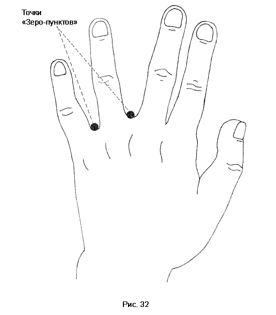 Третий уровень соответствует безымянному пальцу, который является каналом взаимодействия с подсознанием. Техника считывания чувственной информации та же, что и при работе с мизинцем. Нужно обхватить пальцами правой руки весь безымянный палец, представить, что вы втягиваете информацию с этого уровня, и сосредоточить внимание на ощущениях. Появится чувство, аналогов которому в нашем обиходе, пожалуй, нет. Можно лишь приблизительно описать его через опосредованные аналогии: например, пустота, окруженная со всех сторон темными берегами, или две скалы, нависающие над благополучием... Словесная модель весьма приблизительна и не передает истинного смысла ощущений. Но кому довелось почувствовать это, тот поймет, какая информация заключена в странных образах подсознания. Внутренние переживания очень разные: тонкие, нежные, грубые... Они являются особым языком общения организма с сознанием. Бессознательные уровни психики и физиологические системы не могут обычным образом рассказать о том, что происходит внутри. А язык ощущений необычайно богат и разнообразен, он понимается однозначно. Ни у кого не возникнет сомнений по поводу того, приятно ему ощущение или нет... Если процесс — полезный для жизни, то и ощущение будет приятным. Если же вам плохо, значит, процесс, породивший ощущения, вреден. Это несложное правило и будет основным критерием оценки внутренних переживаний. Ощущения, возникающие во время контакта левого безымянного пальца с правой рукой, могут быть разнообразными. Важно оценить их с позиции пользы или вреда для организма. Постепенно вы научитесь правильно понимать сигналы подсознания. Информационные пальцы помогут вам понять и кармическую информацию, которая также считывается с определенных точек и зон на руке. У основания безымянного пальца есть так называемые «зеро-пункты». Это точки, с которых можно считывать кармическую историю человека. Обхватите щепоткой пальцев правой руки основание безымянного пальца на левой руке. Зафиксируйте ощущения, а потом представьте, что будто пылесосом втягиваете сквозь пальцы правой руки энергию и информацию из «зеро-пунктов». Найти их несложно. В основании пальца, с обеих сторон сустава, есть небольшие углубления, в которых и расположены информационные точки (рис. 32). Когда вы представите, что тянете сквозь пальцы энергетическую информацию, поначалу в воображении появится пустота. Изменения происходят постепенно. Возникнет неясное ощущение, которое становится все более отчетливым, и наконец появляется образ. Если образа нет — не переживайте! Ощущения несут большой информационный заряд. Внимательно слушая их, вы поймете почти все! Для примера расскажу реальный случай. Пришлось мне работать с одной женщиной. В 30 лет она ослепла без всяких видимых причин и жила слепой уже несколько лет. Врачи констатировали дистрофию зрительного нерва, нашли еще какие-то отклонения, а вот до причин так и не докопались. Когда через «зеро-пункты» удалось настроиться на ощущения, идущие из глубин ее психики, возник образ: высокий обрывистый берег холодного северного моря. Ледяной ветер гонит на скалы мощные волны. А на вершине скалы стоит юноша. Он холоден внутри, как северное море, глаза невидяще устремлены вдаль.