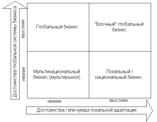 Это предельная форма интернационализации бизнеса. Ее распространению способствуют: К числу существенных преимуществ глобализации относятся экономия на масштабе, что часто определяет положение фирмы в конкурентной борьбе. Конкурентный статус в глобальном бизнесе можно оценить с помощью следующей матрицы положения в интернациональной конкуренции: