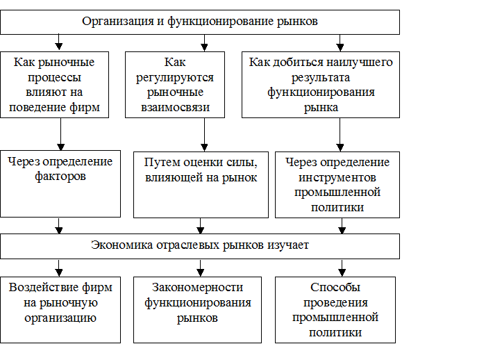 Теория отраслевой организации рынков исследует закономерности формирования и функционирования разного рода рыночных структур и отраслей, основные принципы поведения фирм на разных рынках, результаты и последствия такого поведения для экономики в целом, варианты отраслевой политики государства (рис. 2). Теория отраслевых рынков предусматривает развитие инструментария экономического анализа применительно к более глубокому исследованию рыночных структур, углубление понимания закономерностей функционирования отраслей, рынков и фирм, более полное изучение возможности и необходимости государственного регулирования отраслевой структуры.
