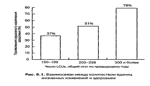ОБСУЖДЕНИЕ Холмс и Рейх отмечают в своей работе, что определенно имеется нечто общее для всех включенных в данный перечень жизненных событий. Каждый раз, когда в жизни человека случается какое-либо из этих стрессогенных событий, оно требует от него адаптации, изменения или усилия совладания (coping). «Акцент, — пишут авторы, — должен быть сделан на изменении существующего устойчивого состояния, а не на психологическом значении, эмоции или социальной желательности» (р. 217). Это позволяет объяснить, почему некоторые события могут одними людьми интерпретироваться как позитивные, а другими — как негативные, но в любом случае требуется изменение и продуцируется состояние стресса. Напомним, что в этой статье обсуждается исследование, проведенное в целях разработки метода измерения жизненных стрессов. Если вы хотите испытать его на себе, просмотрите перечень событий и отметьте жизненные изменения, которые произошли в вашей жизни за последние 12 месяцев. Каждому изменению соответствует определенное количество баллов, называемых единицами жизненных изменений (life change units — LCUs). Подсчитайте ваше общее число таких единиц. Вы получите показатель своего уровня жизненного стресса. Проделав все это, вы, вероятно, почувствуете, что чего-то здесь не хватает. Действительно, это так. Без ответа пока еще остается вопрос: что полученный вами показатель означает для вашего здоровья? Это тот самый вопрос, для получения ответа на который и предназначалась данная шкала. Стремясь разрешить эту проблему, Холмс и Рейх не остановились на разработке шкалы SRRS, но стали исследовать соотношение между итоговыми значениями по шкале и вероятностью заболевания. В конце 1960-х годов шкалу SRRS стали использовать во многих исследованиях в качестве инструмента для определения связи между стрессом и болезнями. Ценность шкалы состояла в том, что она позволяла предсказывать болезнь на основе общего (суммарного) показателя единиц жизненных изменений. В одном из первых исследований нескольким тысячам человек было предложено заполнить SRRS и сообщить свои истории болезни. На рис. 6.1 графически представлены обобщенные данные этого исследования (см.: Holmes and Masuda, 1974). В другом исследовании принимали участие 2500 членов экипажей морских судов во время полугодового плавания. Непосредственно перед отплытием у участников исследования с помощью шкалы SRRS измерялись показатели LCUs за последние