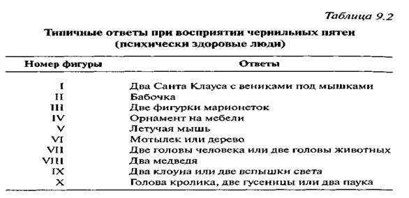 Чтобы выяснить, чем отличаются различные группы людей при выполнении теста чернильных пятен, Роршах и его помощники проводили тест с представителями нескольких психологических групп. Эти группы включали психически здоровых людей с различным уровнем образования, больных шизофренией и пациентов с маниакально-депрессивным расстройством. Таблица 9.2 представляет типичные ответы, полученные Рор-шахом при предъявлении испытуемым 10 форм чернильных пятен.
