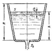 Если напор, а, следовательно, и скорость истечения изменяются медленно, то движение в каждый данный момент времени можно рассматривать как установившееся, и для решения задачи применить уравнение Д. Бернулли (квазистационарное течение). Обозначив переменную высоту уровня жидкости в сосуде, отсчитываемую от дна, через h, площадь сечения резервуара на этом уровне S, а площадь отверстия S0 и взяв бесконечно малый отрезок времени dt, можно записать следующее уравнение объемов: