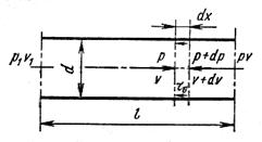 Число Рейнольдса может изменяться вдоль потока в трубе постоянного диаметра лишь за счет изменения вязкости Двумя бесконечно близкими друг к другу сечениями выделим элемент трубы длиной dx (рис. 17.4). Пренебрегая неравномерностью распределения скоростей по сечению, обозначим скорость в левом сечении трубы