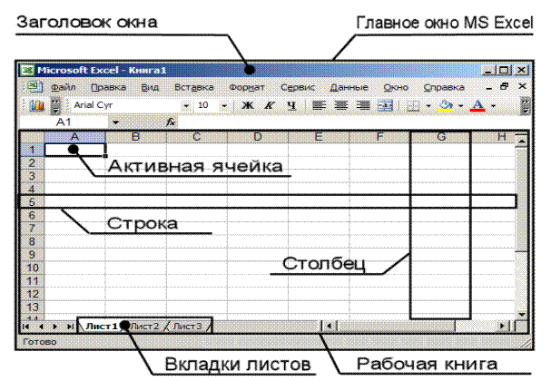 курсор мыши к команде «Microsoft Office», после чего, в появившемся каскадном меню подвести курсор мыши к команде «Microsoft Excel 2003/2007» и выполнить однократное нажатие ЛКМ (Рис. 3). Если Ваше меню «Пуск» выглядит так, как показано на рисунке 2б, то следует подвести курсором мыши к команде меню "Программы", затем в открывшемся справа Рис. 3 каскадном меню подвести курсор мыши к команде «Microsoft Office» и выполнить однократное нажатие ЛКМ (Рис. 2б). После этого на экране появится Главное окно программы Microsoft Excel (Рис. 4). Одновременно с запуском программы будет автоматически создан и новый документ, которому будет присвоено имя "Книга1". Название документа отображается в заголовке окна Microsoft Excel (Рис. 4). Документ "Книга1" состоит из трёх рабочих листов, которые называются "Лист1", "Лист2" и "Лист3" соответственно. Названия листов и текущий лист отображаются внизу рабочей книги при помощи вкладок. Каждая вкладка носит имя соответствующего ей листа. Каждый лист рабочей книги Microsoft Excel состоит из строк и столбцов и называется таблицей. Строки и столбцы разделены на ячейки. Ячейка, обведённая жирной чёрной линией, называется "активной ячейкой" (Рис. 4).