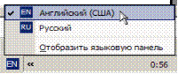 После этого, в появившемся меню выбора языка клавиатуры необходимо подвести курсор мыши к сокращённому названию русского языка Рис. 2. – «RU», указанного в параметре макрокоманды языковая панель (Рис. 2) и выполнить однократное нажатие ЛКМ. После этого язык клавиатуры изменится на русский.
