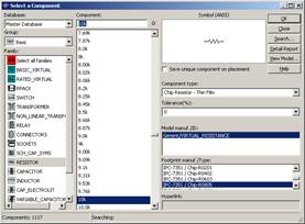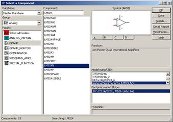 Рис. 2 Затем необходимо подключить питание ОУ (DC voltage source) и выбрать остальные компоненты схемы (AC voltage source – в качестве источника входного сигнала, резисторы и конденсаторы). На соответствующие компоненты показаны на Рис. 3 и Рис. 4. В данном примере выбраны микроконденсаторы и микрорезисторы для поверхностного монтажа, широко применяемые в автоматизированных линиях производства печатных плат. При необходимости применения плат ручного монтажа тип компонентов необходимо выбрать в соответствии с техническими требованиями.