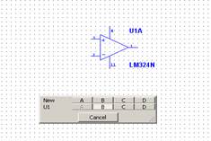 Рис. 1 Выберите соответствующую микросхему (ОУ) и поместите на рабочем поле, как показано на Рис. 2. Обратите внимание, что данная микросхема содержит 4 операционных усилителя в одном корпусе, но мы используем только один из них (А).