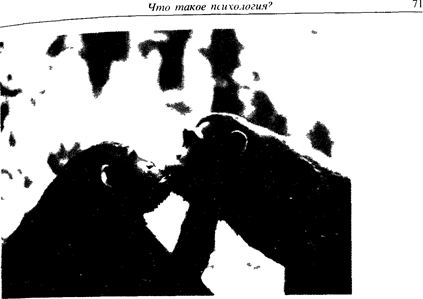 Рис. 2.13. Наблюдения Джейн Гудолл над шимпанзе в лесу показали, что поцелуи у них так же обычны, как и у людей, и служат, выражением симпатии или приветствием. Этология. Этология и зоопсихология пытаются понять, каким образом врожденные механизмы, направляющие возникновение и развитие поведения, дополняются влиянием среды, с которой они вступают во взаимодействие. Согласно взглядам этой школы, лишь все больше углубляя наши знания о низших организмах, мы сможем лучше понять основы поведения и его эволюции в царстве животных. Например, работы Лоренца по механизму импринтинга или изучение развития пения у зяблика помогут нам многое узнать о происхождении социального поведения или об обмене информацией у высших организмов. Более того, эволюционная теория учит нас, что человек – в конечном счете лишь один из видов отряда приматов, который просто дальше продвинулся в своей эволюции, чем другие. За последние два десятилетия возросло число исследований в одном из разделов этологии: речь идет об этологии человека, цель которой – осветить биологические основы человеческой природы (см. рис. 2.13). Один из путей достижения этой цели состоит в систематическом сборе данных о способах выражения эмоций, о чувствах и различных социальных взаимодействиях у представителей различных культур. Касается ли это таких элементарных форм поведения, как улыбка или нахмуривание бровей, поцелуй или угро- 72 Глава 2 жающий кулак, роли социальных структур в отношениях между родителями и детьми или иерархической организации в группе индивидуумов этология человека утверждает, что во всех случаях существуют некие «универсальные» проявления, свойственные всем представителям вида Homo sapiens. Следовательно, человек, подобно всем животным, запрограммирован, и навыки, которые он приобретает в течение жизни, могут реализоваться лишь в пределах заложенной в нем программы. Социобиология. Это новое направление, ставшее популярным в США после публикации в 1975 году книги Уилсона (Е. Wilson). В своих представлениях о природе человека оно идет гораздо дальше, чем этология. Социобиологию определяют как «науку, систематически изучающую биологические основы всех форм социального поведения». Она пытается синтезировать данные, собранные экологией, этологией и эволюционной теорией, обогащенной достижениями генетики. Социобиология утверждает, что живые существа постоянно конкурируют между собой, стремясь обеспечить себе наилучшие шансы на успешную передачу потомству своих генов, т. е. носителей наследственных признаков. Иными словами, все формы социального поведения, свойственные различным видам и в особенности человеку, существуют лишь постольку, поскольку они обеспечивают передачу последующим поколениям возможно большего числа генов, исходя из чисто «эгоистических» принципов. Таким образом, идет ли речь о стремлении к власти или об альтруистическом поведении, о ксенофобии или о гомосексуализме, об отношении к религии или о морали – все эти аспекты человеческой деятельности проявляются только для того, чтобы дать индивидууму возможность передать дальше свой генетический материал. В таком случае организм – это просто некая машина, обеспечивающая сохранность генов, а разные формы его поведения – всего лишь стратегии для наиболее активного распространения этих гено